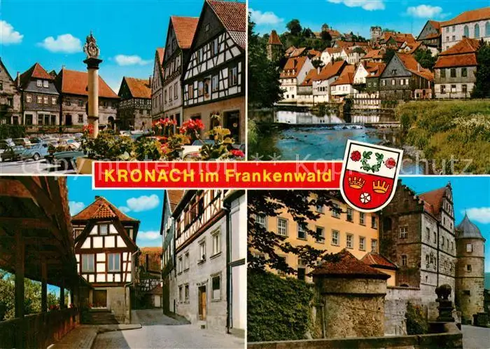 Kronach_Oberfranken Marktplatz Brunnen Fachwerkhaeuser Hasslach Altstadt Veste Rosenberg Wehrgang Fachwerkhaeuser Stadtmauer Turm Kronach Oberfranken postalisch nicht gelaufen nach 1965 Erhaltung siehe scans [FriedD77] Frierer