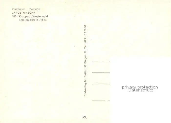 Kroppach Gasthaus Pension Haus Hirsch Kroppach postalisch nicht gelaufen nach 1965 Erhaltung siehe scans [KathaD81] Kathoren