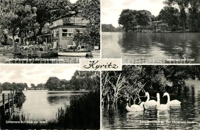 AK / Ansichtskarte Kyritz_Brandenburg Inselrestaurant Untersee Insel Uferpartie am See Schwaene Kyritz Brandenburg