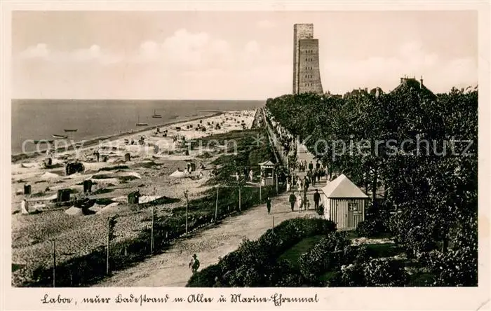 AK / Ansichtskarte Laboe Badestrand mit Allee und Marine Ehrenmal Laboe