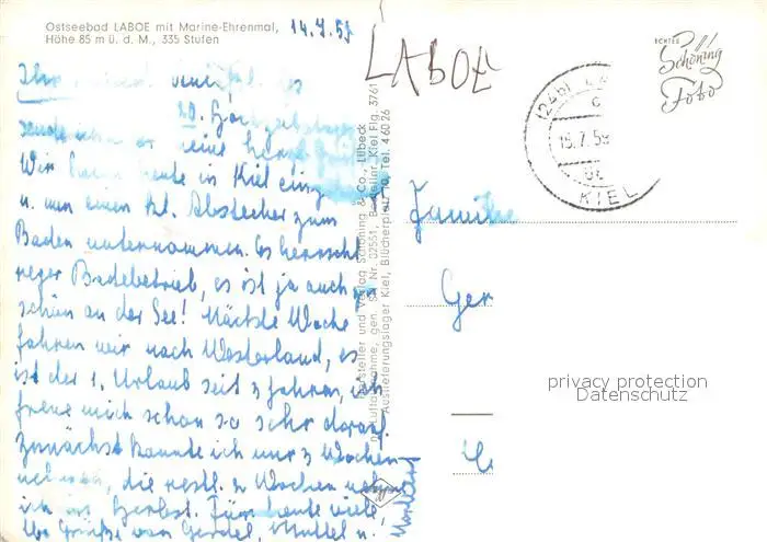 Laboe Fliegeraufnahme mit Marine Ehrenmal Laboe postalisch gelaufen 1959 Erhaltung siehe scans [WerneD78] WernPID7