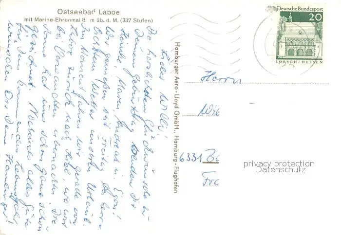 Laboe Fliegeraufnahme mit Marine Ehrenmal Laboe postalisch gelaufen nach 1965 Erhaltung siehe scans [WerneD78] WernPID7