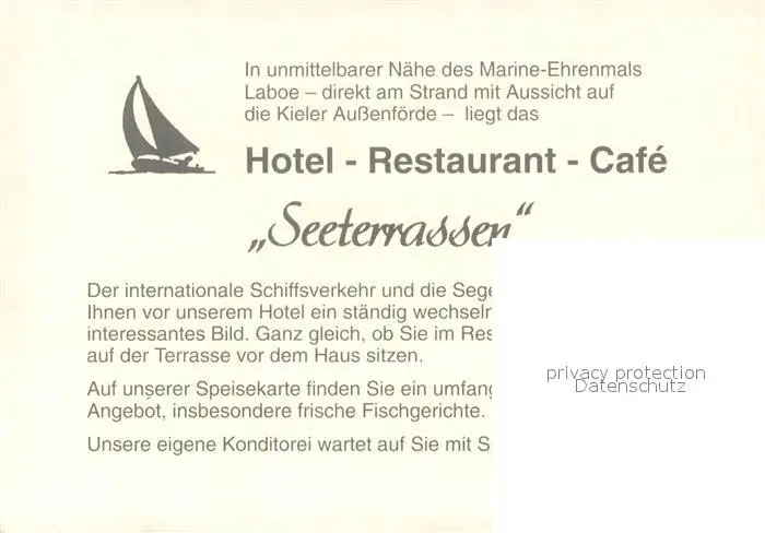Laboe Hotel Restaurant Café Seeterrassen Marine Ehrenmal Kieler Aussenfoerde Laboe postalisch nicht gelaufen nach 1965 Werbekarte (keine Postkarte) Erhaltung siehe scans [FriedD77] Werbekarte (keine Postkarte) Frierer