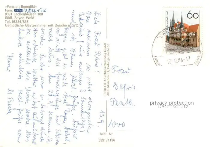 Lackenhaeuser_Niederbayern Pension Benedikt Gastraum Garten Lackenhaeuser Niederbayern postalisch gelaufen 1984 Erhaltung siehe scans [FriedD77] Frierer