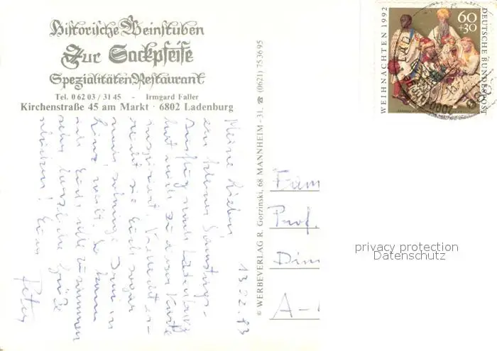 Ladenburg Historische Weinstuben Zur Sackpfeife Ladenburg postalisch gelaufen 1993 Erhaltung siehe scans [WerneD78] WernPID7