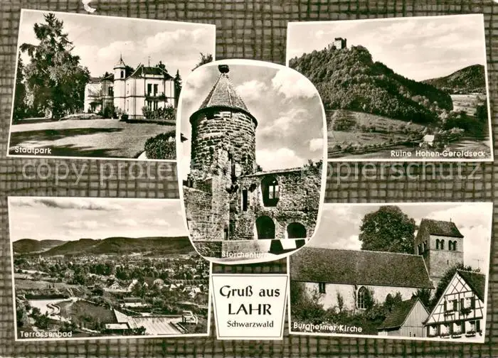 AK / Ansichtskarte Lahr_Baden Stadtpark Ruine Hohen Geroldsecke Storchenturm Terrassenbad Burgheimer Kirche Lahr_Baden