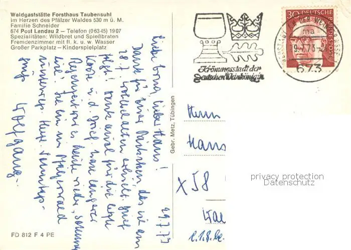 Landau__Pfalz Waldgaststaette Forsthaus Taubensuhl Gastraeume Kaminzimmer postalisch gelaufen 1973 Erhaltung siehe scans [FriedD77] Frierer