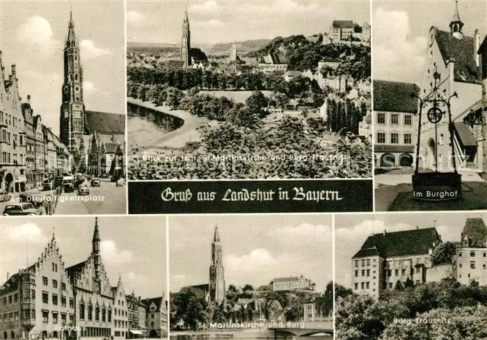 AK / Ansichtskarte Landshut_Isar Dreifaltigkeitsplatz Burg Trausnitz St. Martinskirche Rathaus Landshut Isar