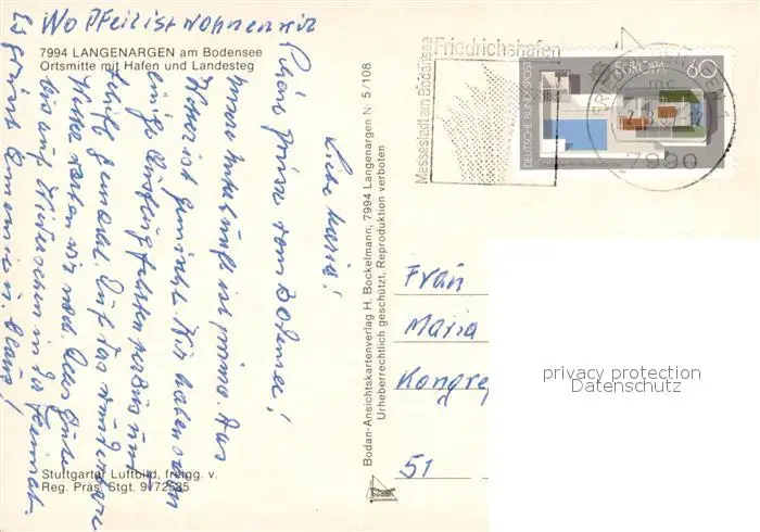 Langenargen_Bodensee Ortsmitte mit Hafen und Landesteg Langenargen Bodensee postalisch gelaufen 1987 Fliegeraufnahme Erhaltung siehe scans [FriedD77] Fliegeraufnahme Frierer