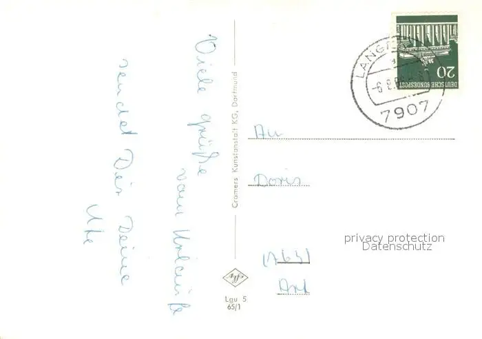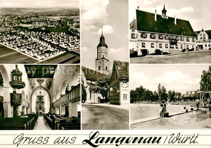 Langenau_Wuerttemberg Kirche Innenansicht Freibad Rathaus Fliegeraufnahme Langenau Wuerttemberg postalisch gelaufen 1966 Erhaltung siehe scans [FriedD77] Frierer