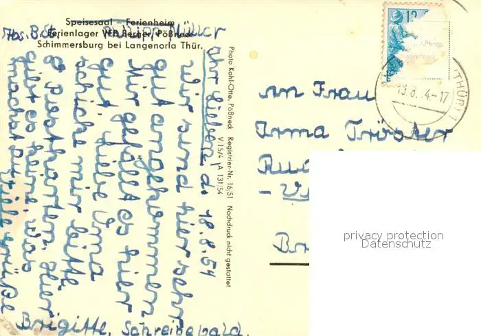Langenorla Kategorie Alte Ansichtskarten Postkarten bx62379 Langenorla Ferienlager Schimmersburg Langenorla postalisch gelaufen 1954 Erhaltung siehe scans [KathaD81]