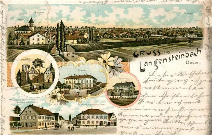 Langensteinbach_Karlsbad Kategorie Alte Ansichtskarten Postkarten bx56268 Langensteinbach_Karlsbad Schule Kirche Gasthaus gruenen Baum Langensteinbach_Karlsbad postalisch gelaufen 1902 Erhaltung siehe scans [NatalD47]