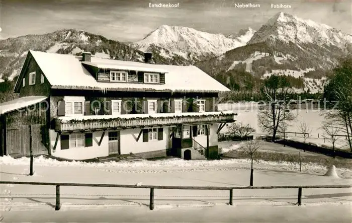 AK / Ansichtskarte Langenwang_Fischen Pension Torfisch Aussenansicht Winter Schnee m. Entschenkopf Nebelhorn Rubihorn Langenwang Fischen