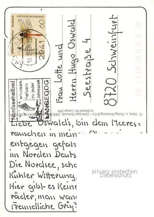 Langeoog_Nordseebad Fliegeraufnahme Duenenweg Wasserturm Ortsansicht Anleger und Yachthafen Langeoog_Nordseebad postalisch gelaufen 1992 Erhaltung siehe scans [WerneD78] WernPID7