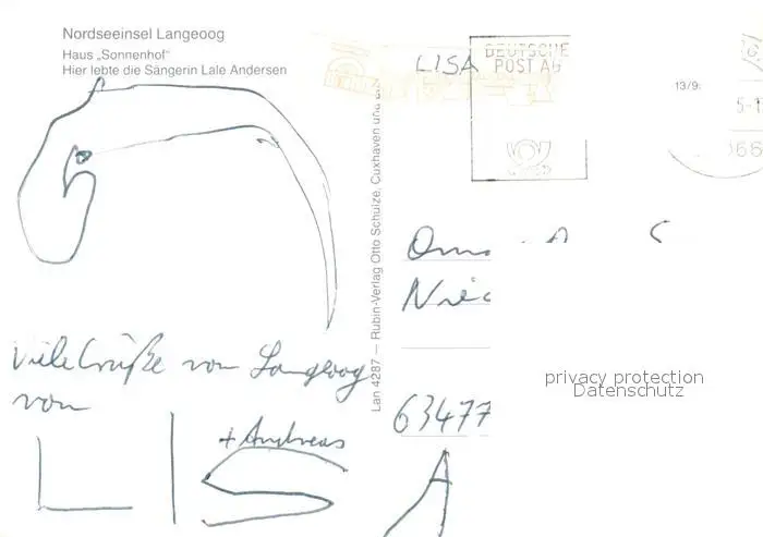 Langeoog_Nordseebad Haus Sonnehof hier lebte die Saengerin Lale Andersen Langeoog_Nordseebad postalisch gelaufen nach 1965 Erhaltung siehe scans [LiesaD40] LiesID40
