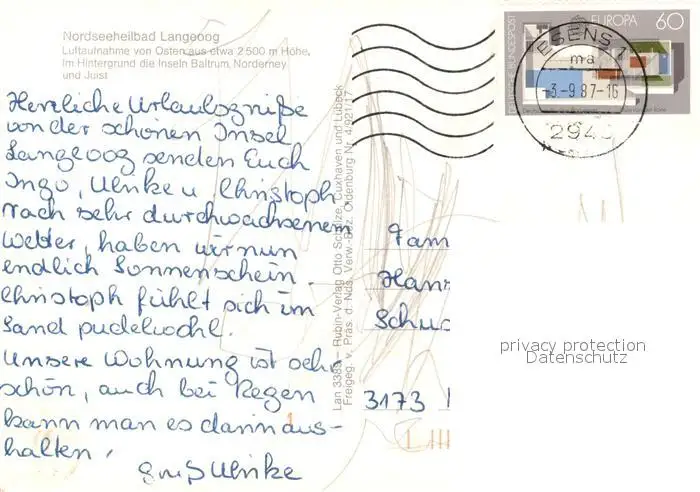 Langeoog_Nordseebad Nordseeinsel Insel Baltrum Norderney und Juist Fliegeraufnahme Langeoog_Nordseebad postalisch gelaufen 1987 Erhaltung siehe scans [FriedD77] Frierer