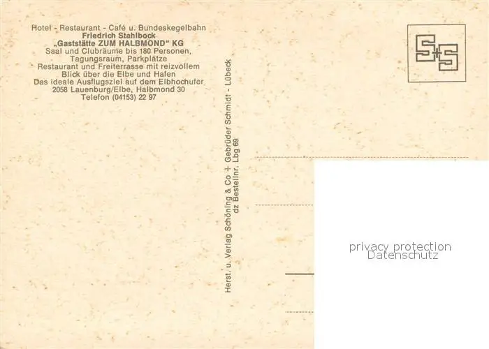 Lauenburg_Elbe Hotel Gaststaette Zum Halbmond Restaurant Panorama Blick ueber die Elbe Lauenburg Elbe postalisch nicht gelaufen nach 1965 Erhaltung siehe scans [FriedD77] Frierer