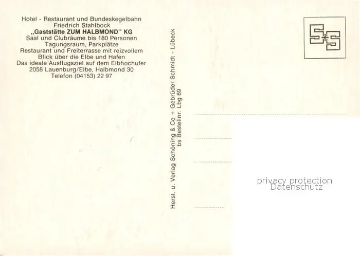 Lauenburg_Elbe Hotel Restaurant Bundeskegelbahn Gaststaette zum Halbmond Panorama Lauenburg Elbe postalisch nicht gelaufen nach 1965 Erhaltung siehe scans [FriedD77] Frierer
