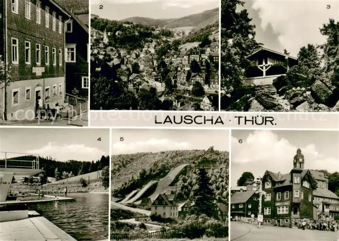 Lauscha Museum fuer Glaskunst Panorama Lauschensten Schutzhuette Schwimmbad Drei-Schanzen-Anlage Huettenplatz Lauscha postalisch nicht gelaufen 1978 Erhaltung siehe scans [FriedD77] Frierer