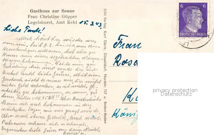 Legelshurst Hauptstrasse Gasthaus zur Sonne Bahnhofstrasse Legelshurst postalisch gelaufen 1943 Erhaltung siehe scans [FriedD77] Frierer