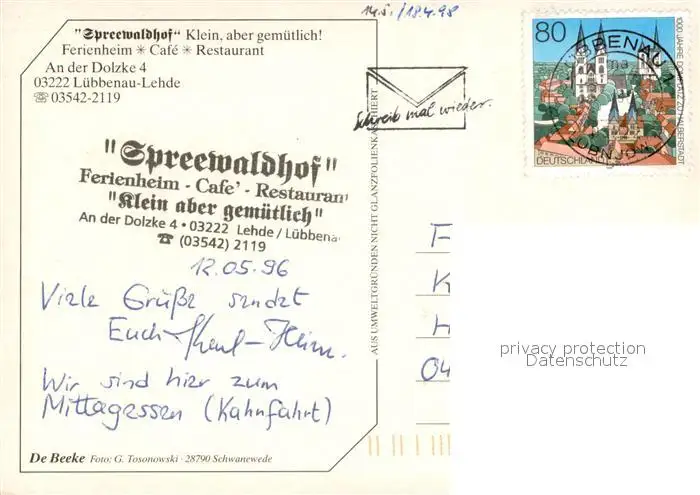 Lehde Ferienheim Spreewaldhof Caf? Restaurant Lehde postalisch gelaufen 1998 Erhaltung siehe scans [LiesaD40] LiesID40