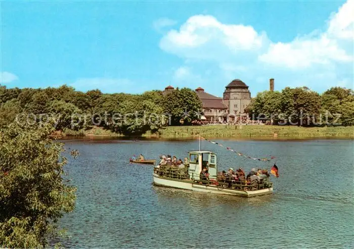 AK / Ansichtskarte Leipzig Auensee Faehrschiff mit Blick zur HO Gaststaette Leipzig