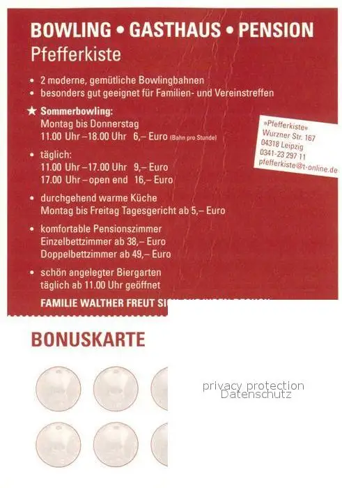 Leipzig Bowling Gasthaus Pension Pfefferkiste Leipzig postalisch nicht gelaufen nach 1965 Werbekarte (keine Postkarte) Erhaltung siehe scans [FriedD77] Werbekarte (keine Postkarte) Frierer