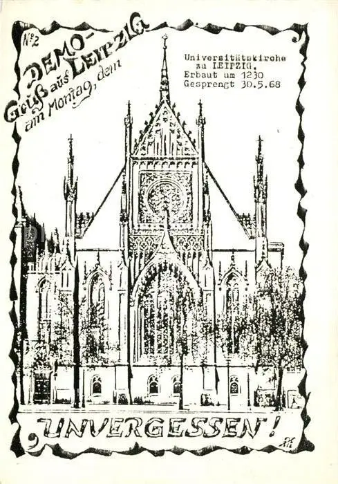 Leipzig Universitaetskirche Gesprengt 1968 Zeichnung Leipzig postalisch gelaufen 1990 Erhaltung siehe scans [KathaD81] Kathoren