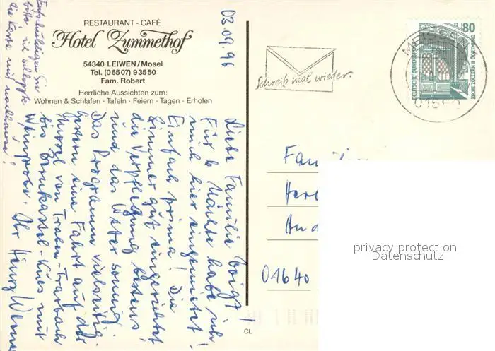 Leiwen_Mosel Restaurant Café Hotel Zummethof Terrasse Landschaftspanorama Moselschleife Leiwen Mosel postalisch gelaufen 1996 Erhaltung siehe scans [FriedD77] Frierer