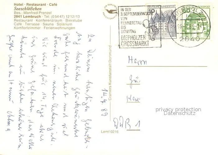 Lembruch Hotel Restaurant Seeschloesschen Gastraeume Zimmer Segelschiffe Lembruch postalisch gelaufen 1989 Erhaltung siehe scans [WerneD78] WernPID7