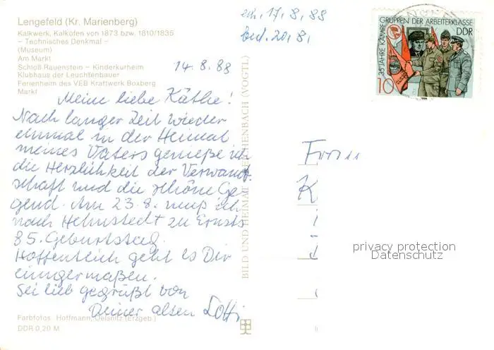 Lengefeld_Erzgebirge Kalkwerk Technisches Denkmal Museum Markt Schloss Rauenstein Kinderkurheim Klubhaus der Leuchtenbauer Ferienheim Markt Lengefeld Erzgebirge postalisch gelaufen 1988 Erhaltung siehe scans [FriedD77] Frierer