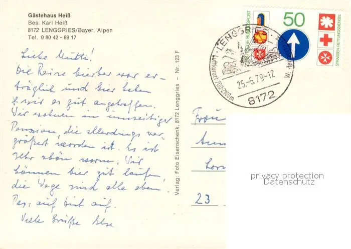 Lenggries Gaestehaus Pension Heiss Ortsmotiv mit Kirche Bayerische Alpen Lenggries postalisch gelaufen 1979 Erhaltung siehe scans [FriedD77] Frierer
