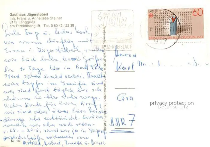 Lenggries Gasthaus Jaegerstueberl Gaststube Lenggries postalisch gelaufen nach 1965 Erhaltung siehe scans [WerneD78] WernPID7