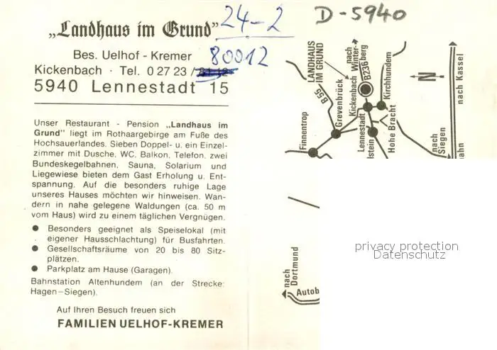 Lennestadt Landhaus im Grund Gaststube Kaminzimmer Kegelbahn Lennestadt postalisch nicht gelaufen nach 1965 Werbekarte (keine Postkarte) Erhaltung siehe scans [WerneD78] Werbekarte (keine Postkarte) WernPID7