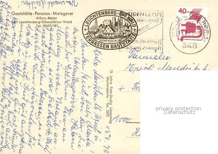Leuchtenberg Gaststaette Pension Maier Restaurant Terrasse Burgruine Naturpark Oberpfaelzer Wald Leuchtenberg postalisch gelaufen 1975 Erhaltung siehe scans [FriedD77] Frierer