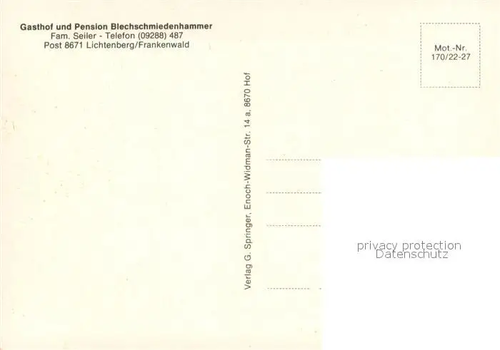 Lichtenberg_Oberfranken Gasthof Pension Blechschmiedenhammer Kaffeeterrasse Gastzimmer Hirschensprung Jungfernstieg Lichtenberg Oberfranken postalisch nicht gelaufen nach 1965 Erhaltung siehe scans [WerneD78] WernPID7