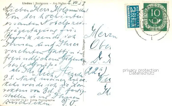 Lindau_Bodensee Hafeneinfahrt mit Loewenstatue Lindau Bodensee postalisch gelaufen 1959 Erhaltung siehe scans [FriedD77] Frierer
