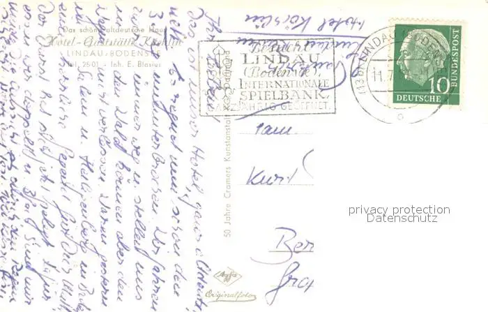Lindau_Bodensee Hotel Gaststaette Koechlin Lindau Bodensee postalisch gelaufen 1957 Erhaltung siehe scans [FriedD77] Frierer