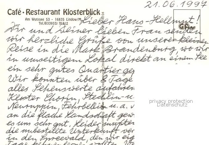 Lindow_Mark Cafe Restaurant Klosterblick Seeterrasse Lindow Mark postalisch nicht gelaufen 1997 Erhaltung siehe scans [FriedD77] Frierer