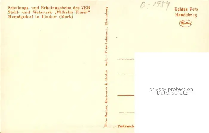 Lindow_Mark Schulungs- und Erholungsheim des VEB Stahl- und Walzwerk Wilhelm Florin Henningsdorf Handabzug Lindow Mark postalisch nicht gelaufen 1957 Erhaltung siehe scans [FriedD77] Frierer