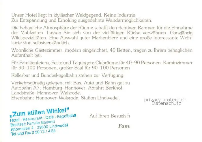Lindwedel Hotel Zum stillen Winkel Informationen Lindwedel postalisch nicht gelaufen nach 1965 Werbekarte (keine Postkarte) Erhaltung siehe scans [LiesaD40] Werbekarte (keine Postkarte) LiesID40