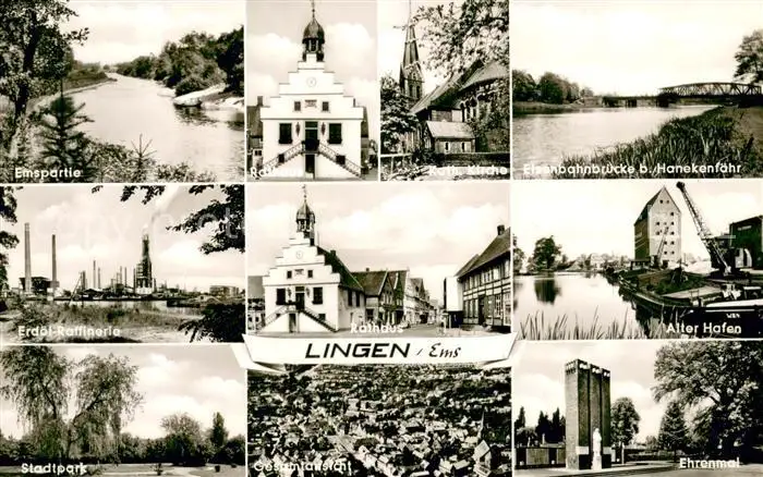 AK / Ansichtskarte Lingen_Ems Rathaus Kirche Alter Hafen Ehrenmal Stadtpark Erdoelraffinerie Eisenbahnbruecke Hanekenfaehr Lingen_Ems