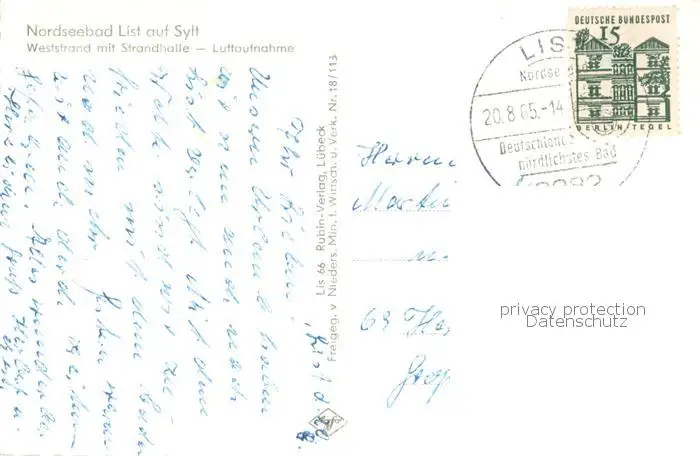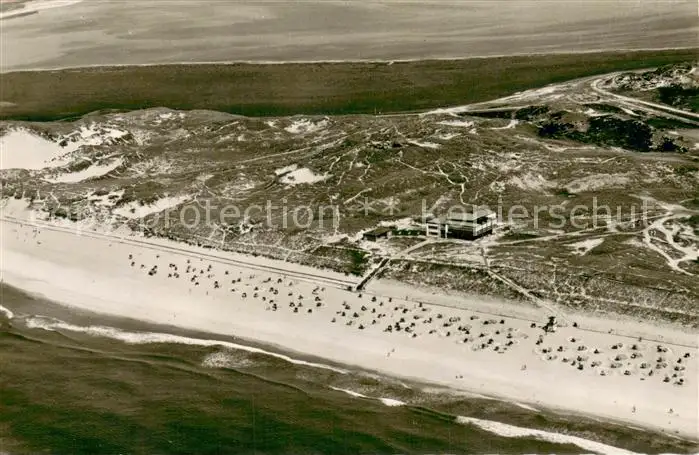 List_Sylt Weststrand mit Strandhalle Nordseebad List_Sylt postalisch gelaufen 1965 Fliegeraufnahme Erhaltung siehe scans [FriedD77] Fliegeraufnahme Frierer