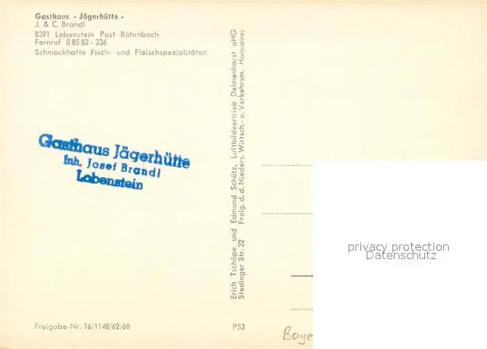 Lobenstein_Roehrnbach Gasthaus Jaegerhuete im Bayerischen Wald Fliegeraufnahmen Lobenstein_Roehrnbach postalisch nicht gelaufen 1921-1965 Erhaltung siehe scans [FriedD77] Frierer