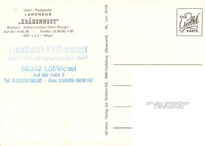 Loef_Mosel Hotel Restaurant Landhaus Kraehennest Loef_Mosel postalisch nicht gelaufen nach 1965 Erhaltung siehe scans [FriedD77] Frierer