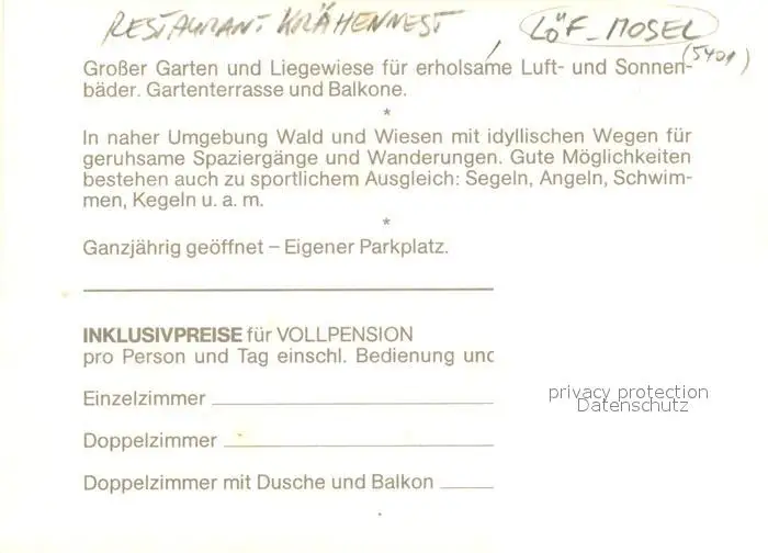 Loef_Mosel Restaurant Kraehennest Gastraeume Loef_Mosel postalisch nicht gelaufen nach 1965 Werbekarte (keine Postkarte) Erhaltung siehe scans [WerneD78] Werbekarte (keine Postkarte) WernPID7