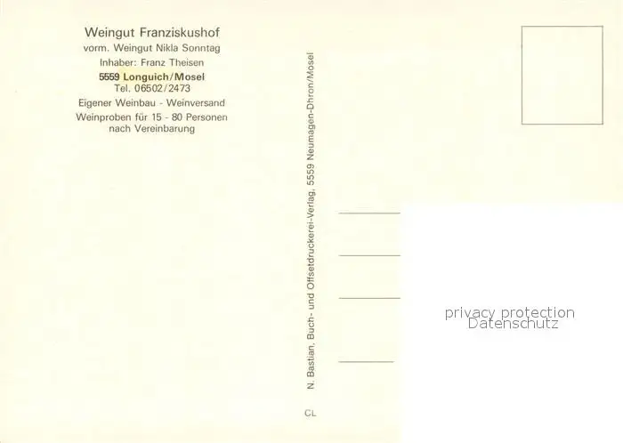Longuich Weingut Franziskus Hof Weinreben Longuich postalisch nicht gelaufen nach 1965 Erhaltung siehe scans [FriedD77] Frierer