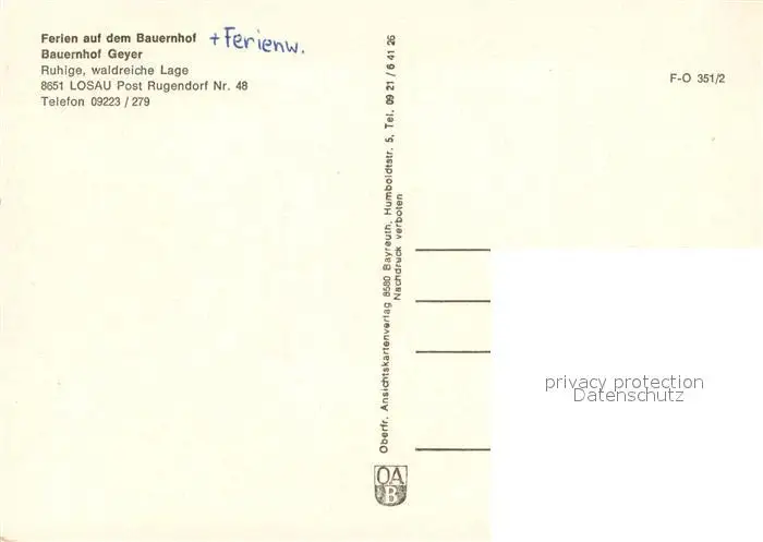 Losau_Rugendorf Ferien auf dem Bauernhof Geyer im Frankenwald Losau Rugendorf postalisch nicht gelaufen nach 1965 Erhaltung siehe scans [FriedD77] Frierer