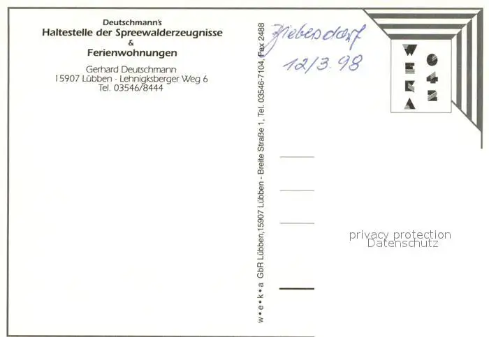 Luebben_Spreewald Deutschmanns Haltestelle der Spreewalderzeugnisse und Ferienwohnungen Luebben Spreewald postalisch nicht gelaufen 1998 Erhaltung siehe scans [WerneD78] WernPID7