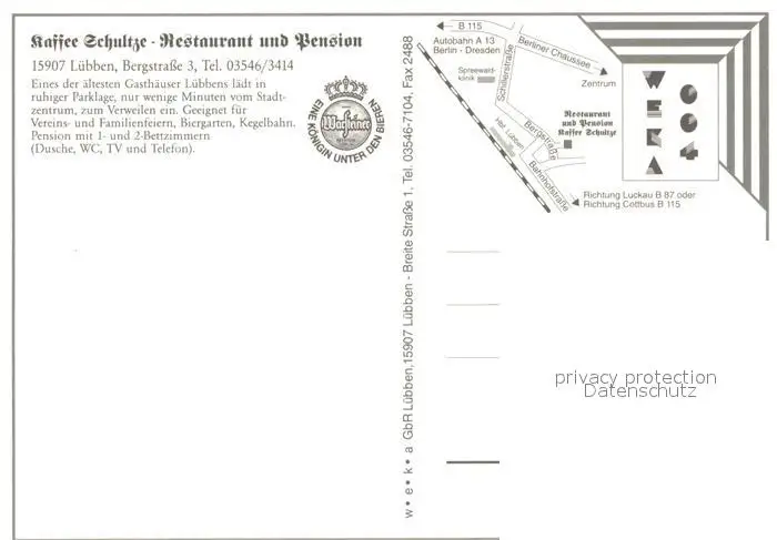 Luebben_Spreewald Kaffee Schultze Restaurant und Pension Luebben Spreewald postalisch nicht gelaufen nach 1965 Erhaltung siehe scans [FriedD77] Frierer